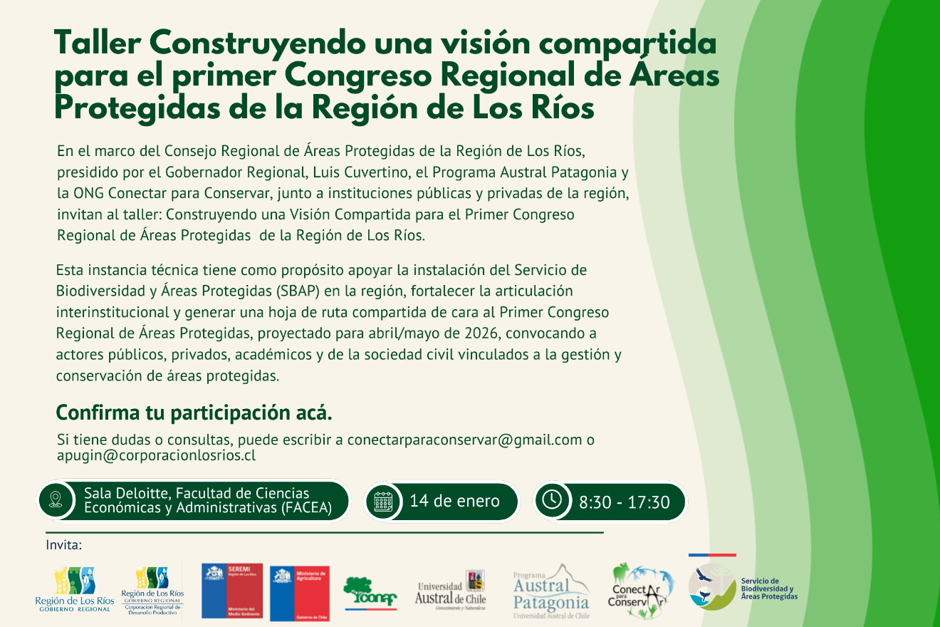 En el marco del Consejo Regional de Áreas Protegidas de la Región de Los Ríos, presidido por el Gobernador Regional, Luis Cuvertino, el Programa Austral Patagonia y la ONG Conectar para Conservar, junto a instituciones públicas, privadas y académicas, convocaron al taller “Construyendo una visión compartida para el Primer Congreso Regional de Áreas Protegidas de la Región de Los Ríos”.